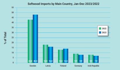 Softwood imports for 2023 were up 0.8% on 2022, with cumulative volume from January-December at 5,722,000m3 (2022: 5,677,000m3).